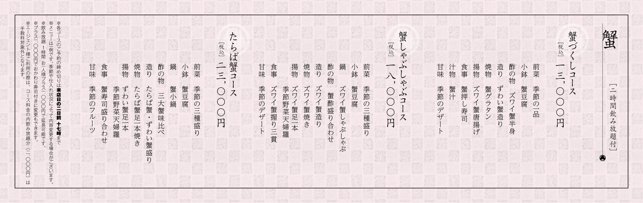 おもてなしや観光に、蟹を存分に味わうコースで、ビールと地酒込の2時間飲み放題付き!